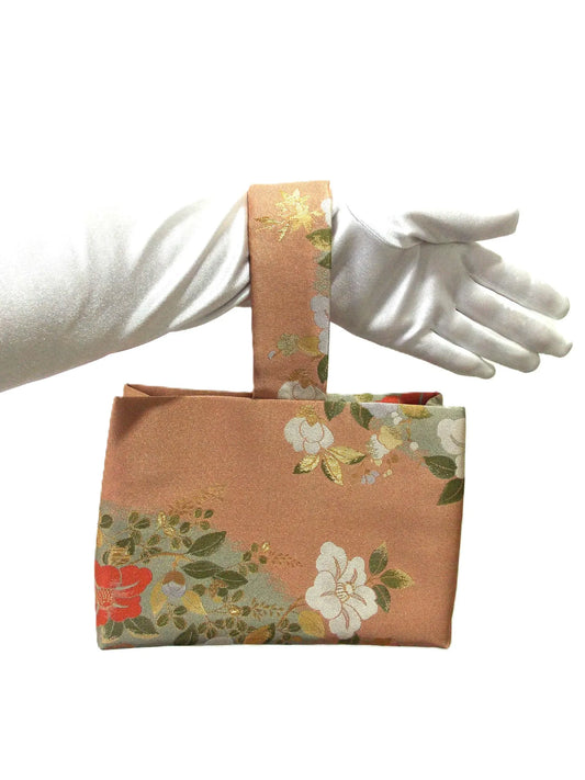 KIMONO Geldbörse Rosa Seiden-OBI mit Goldbrokat lachsrosa Blumengriff Kleine Tasche versandfertig
