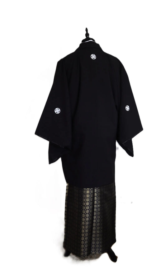 Herren Kimono L XL Vierteiliges Set #21 Vintage MONTSUKI Hakama Kimono Haori Juban Schwarz Gold HAKAMA Größe L XL versandfertig