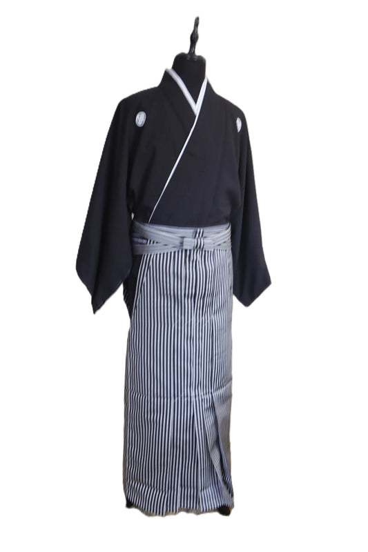 Herren Kimono L XL Vierteiliges Set #21 MONTSUKI Hakama Kimono Haori Juban Schwarz grau gestreift Größe L XL versandfertig