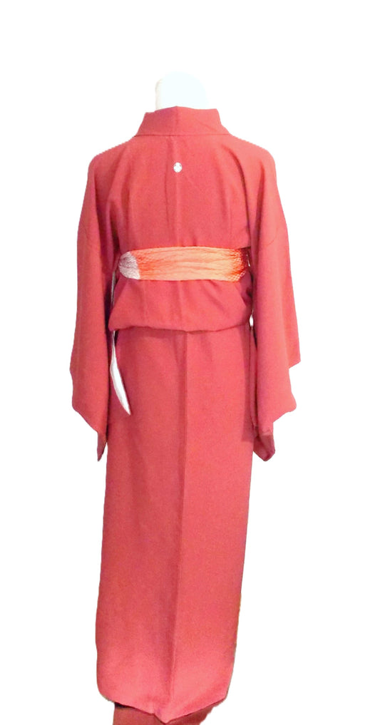 Vintage leichter formeller KIMONO CHIRIMEN HITOTSUMON Familienwappen hell ziegelrosa Größe Groß versandfertig