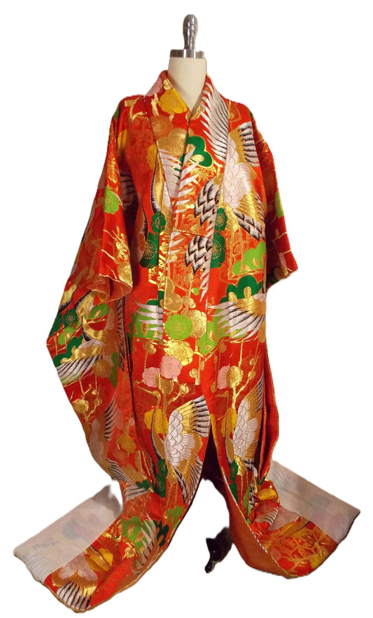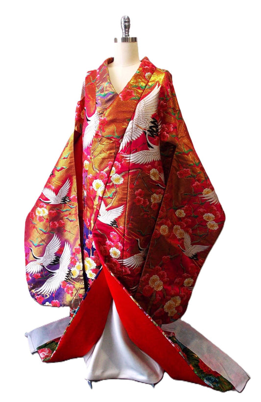 UCHIKAKE Hochzeit Kimono Robe Seide Goldbrokat Kranich Zinnoberrot Grün Rosa Gold Pflaume Sakura Kirschblüte Kiefer Größe frei Versandfertig