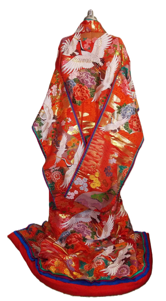 UCHIKAKE Hochzeit Kimono Robe JUNI-HITOE rot gold Sakura Kirschblüte Kranich mehrfarbig Chrysanthemen Blumen Größe frei Versandfertig