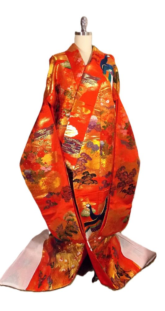 UCHIKAKE Hochzeit Kimono Robe Seide Gold Brokat Pfau Rot Gold Sakura Kirschblüte Chrysantheme Pfingstrose Ahorn Kiefer Größe frei Versandfertig