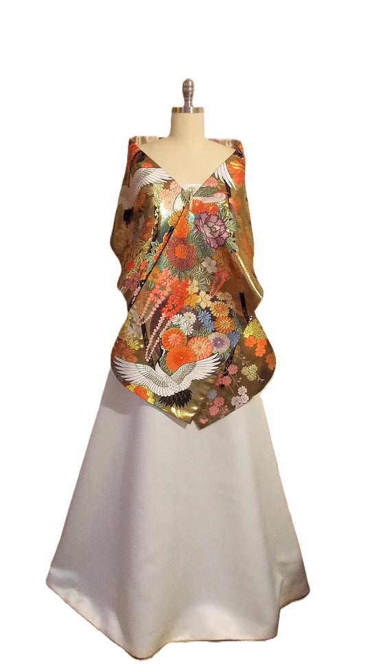 KIMONO Schal Hochzeit Vintage UCHIKAKE Seide Gold Brokat Metallic Gold Kranich Chrysantheme SAKURA Kirschblüte Blume auf Bestellung gefertigt