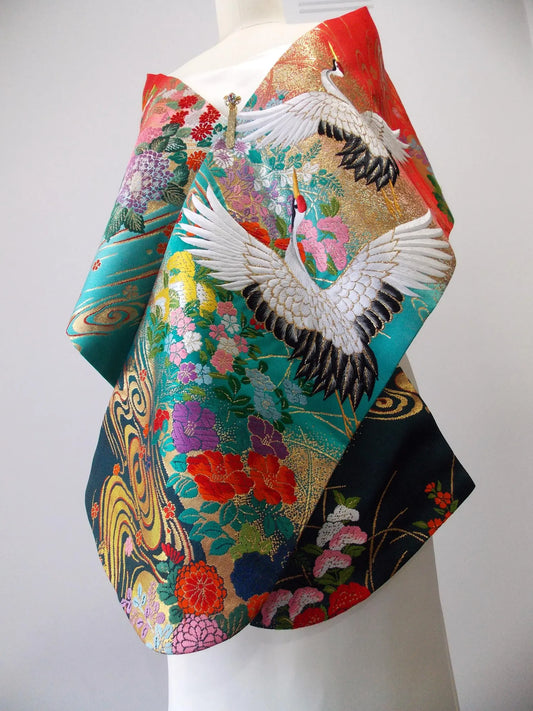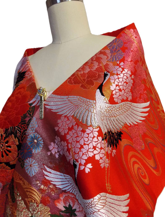 KIMONO Schal Hochzeit Vintage UCHIKAKE Seide Gold Brokat rot rosa mint blau blaugrün gold weiß Kranich Sakura Kirschblüte Blume versandfertig
