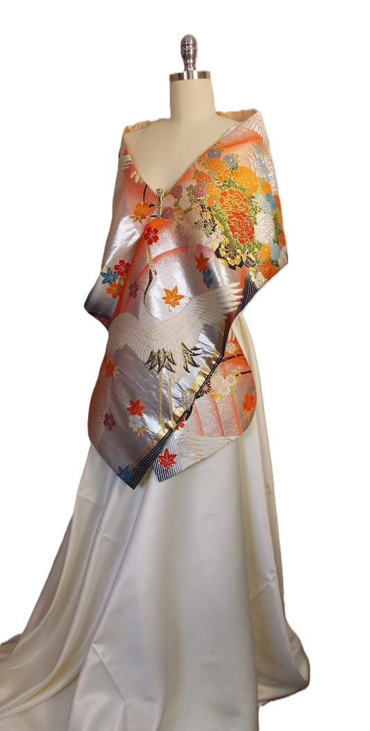 KIMONO Schal Hochzeit Vintage UCHIKAKE Seide Gold Brokat Silber orange grau weiß Kranich Blume versandfertig