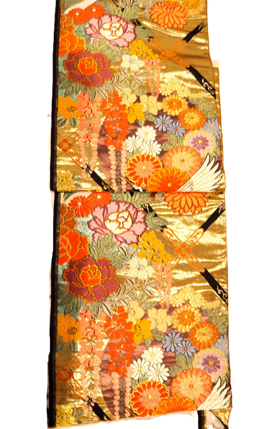 Ceinture KIMONO OBI mariage vintage UCHIKAKE à nouer soi-même en soie brocart doré orange cuivre or grue pivoine jaune rouge vert prêt à être expédié
