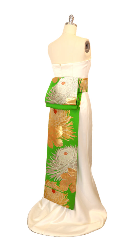 OBI sash long tail pre tied silk gold brocade Fresh Green Gold Silver White Chrysanthemum